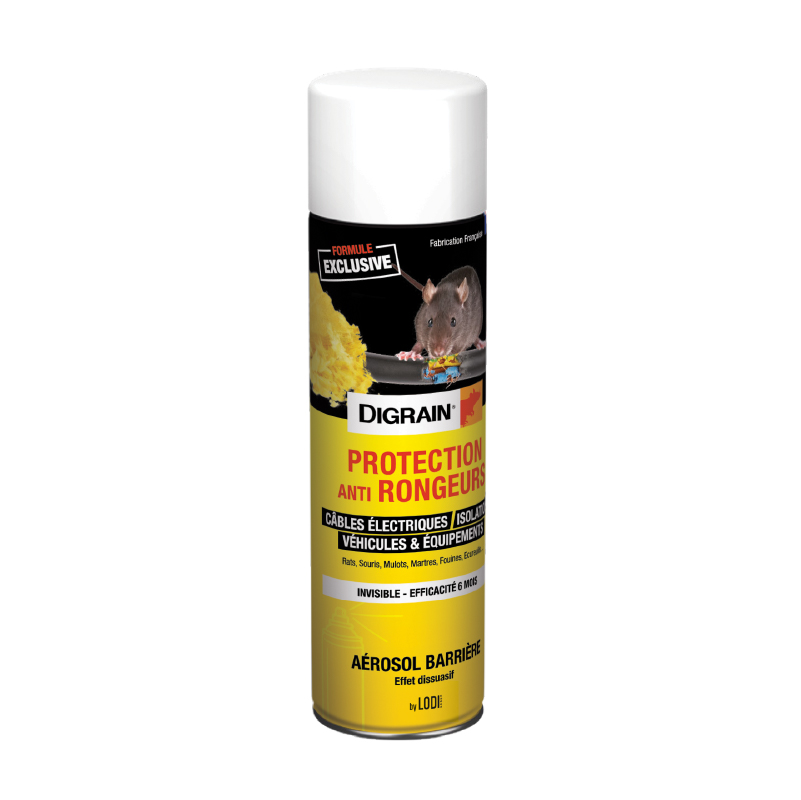 Aérosol barrière contre les rats et les souris. Sa formule exclusive protège les matériaux, câbles électriques, isolations, véhicules, équipements, etc, de l’attaque des rongeurs. Crée un film barrière à effet dissuasif. Protection très longue durée, jusqu’à 6 mois.