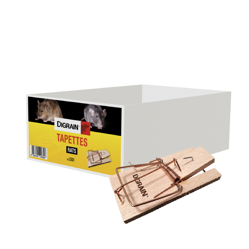 Piège mécanique pour la capture des rats. Méthode simple, économique, rapide et efficace grâce à son ressort puissant. Socle en boîs de hêtre et fil cuivré. Dimensions : L 170 x l 85 mm.